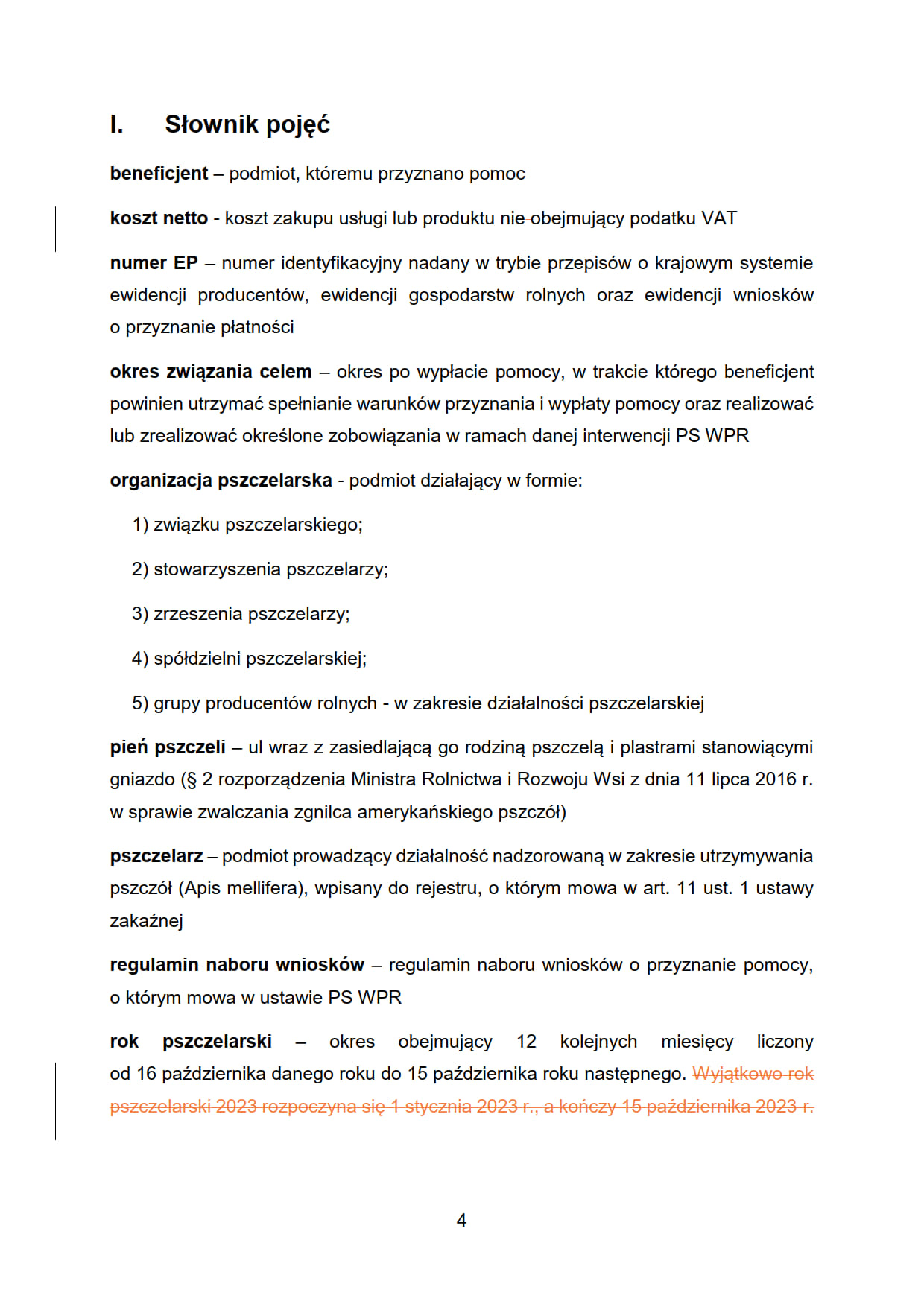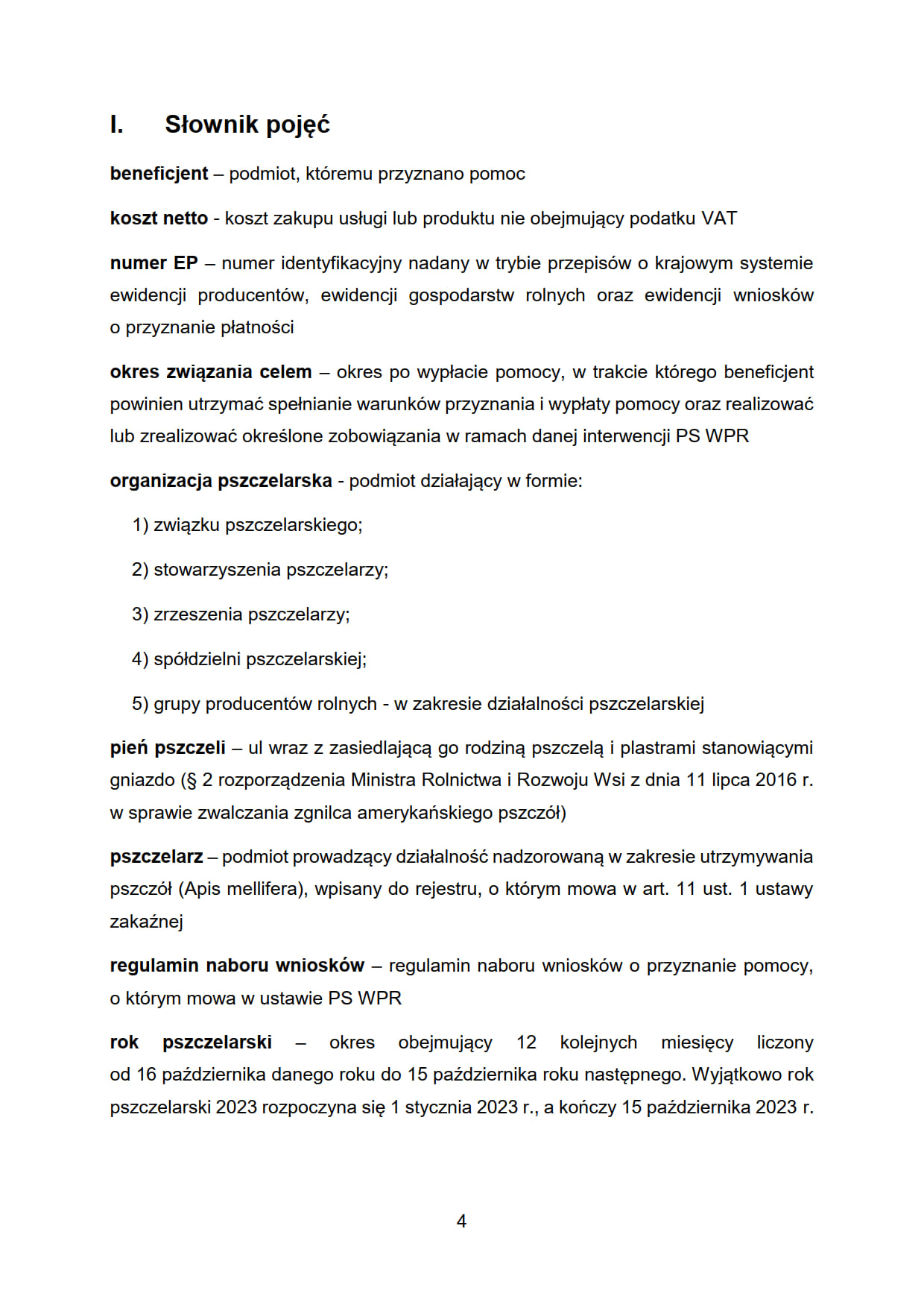 rok pszczelarski – okres obejmujący 12 kolejnych miesięcy liczony od 16 października danego roku do 15 października roku następnego. Wyjątkowo rok pszczelarski 2023 rozpoczyna się 1 stycznia 2023 r., a kończy 15 października 2023 r.