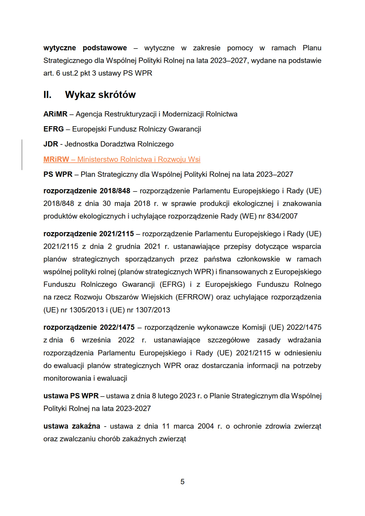 PS WPR – Plan Strategiczny dla Wspólnej Polityki Rolnej na lata 2023–2027 rozporządzenie 2018/848 – rozporządzenie Parlamentu Europejskiego i Rady (UE) 2018/848 z dnia 30 maja 2018 r. w sprawie produkcji ekologicznej i znakowania produktów ekologicznych i uchylające rozporządzenie Rady (WE) nr 834/2007
