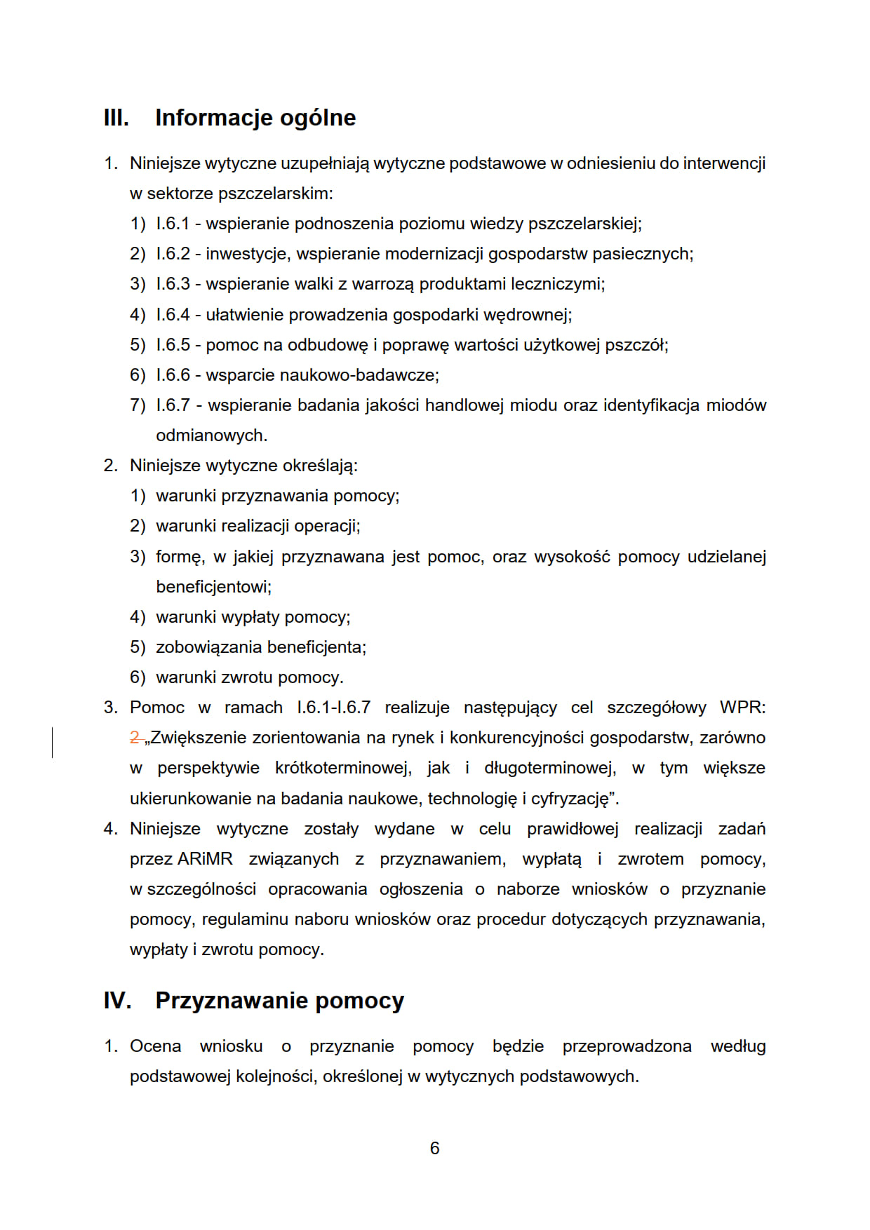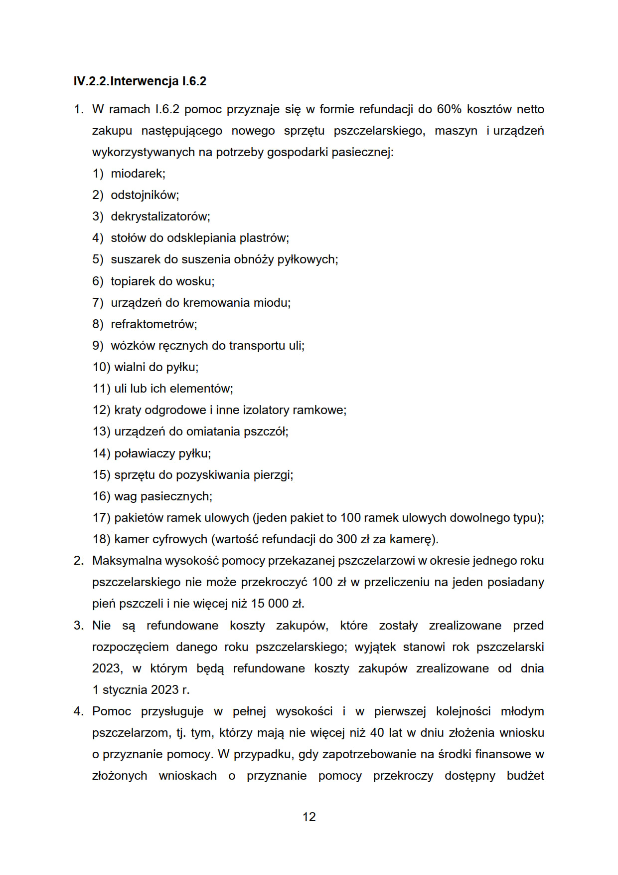 - I.6.2. „Interwencja w sektorze pszczelarskim - inwestycje, wspieranie modernizacji gospodarstw pasiecznych”;