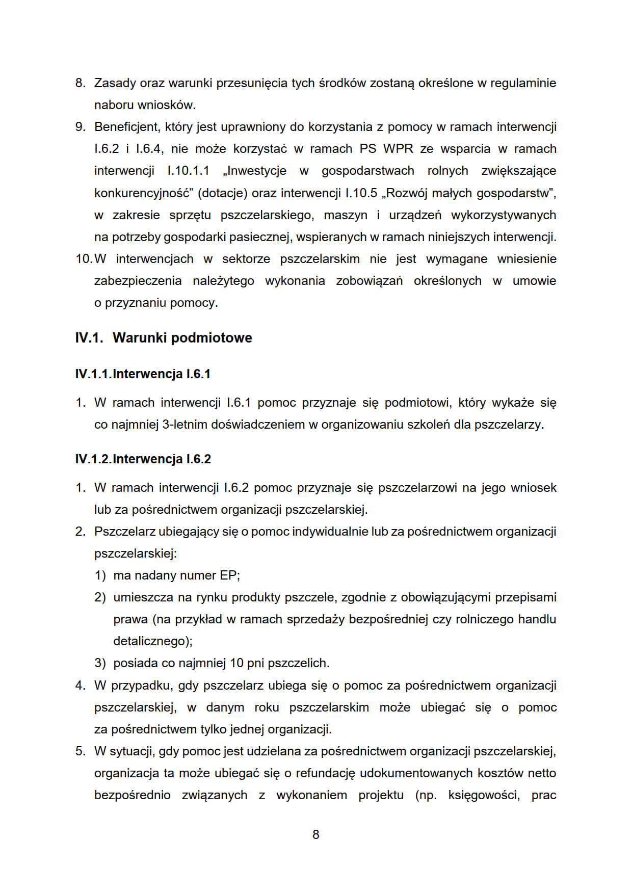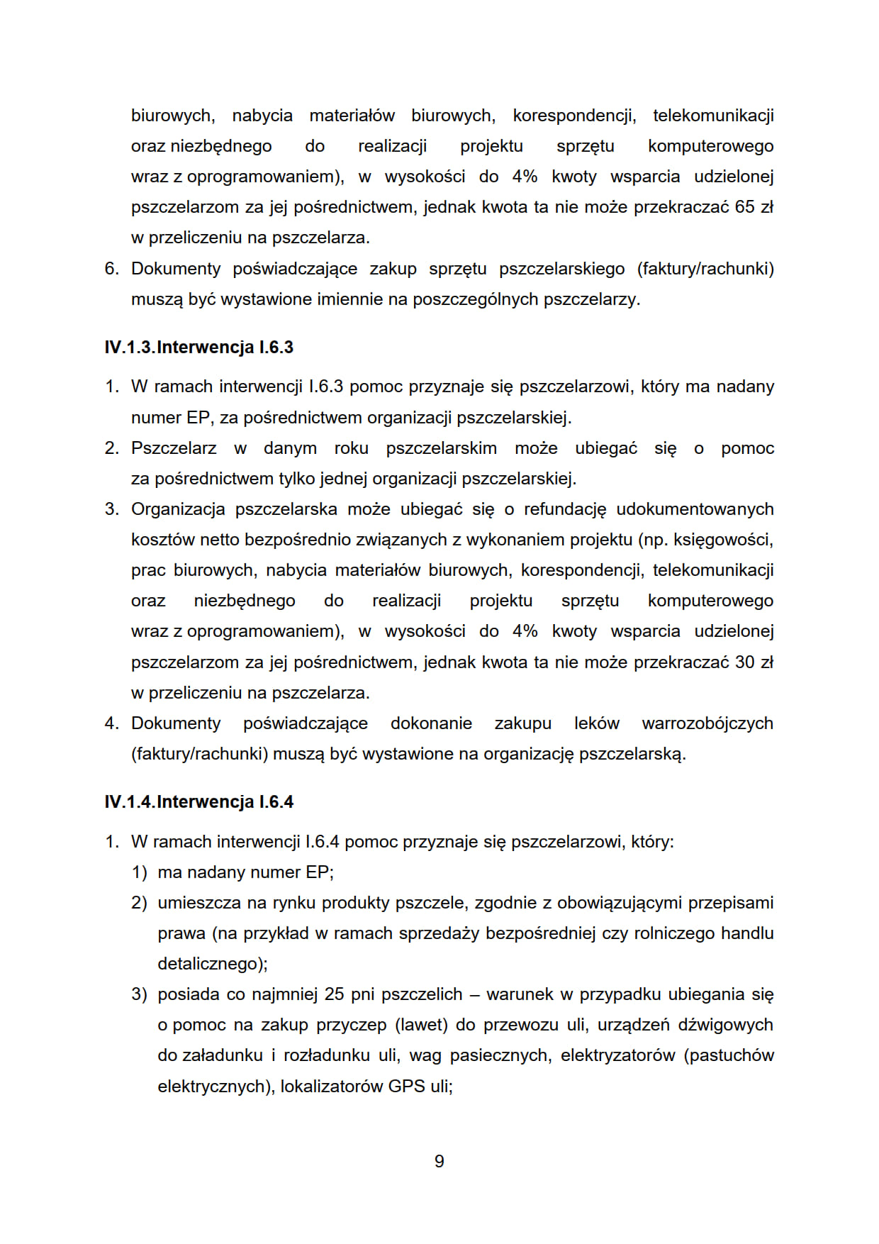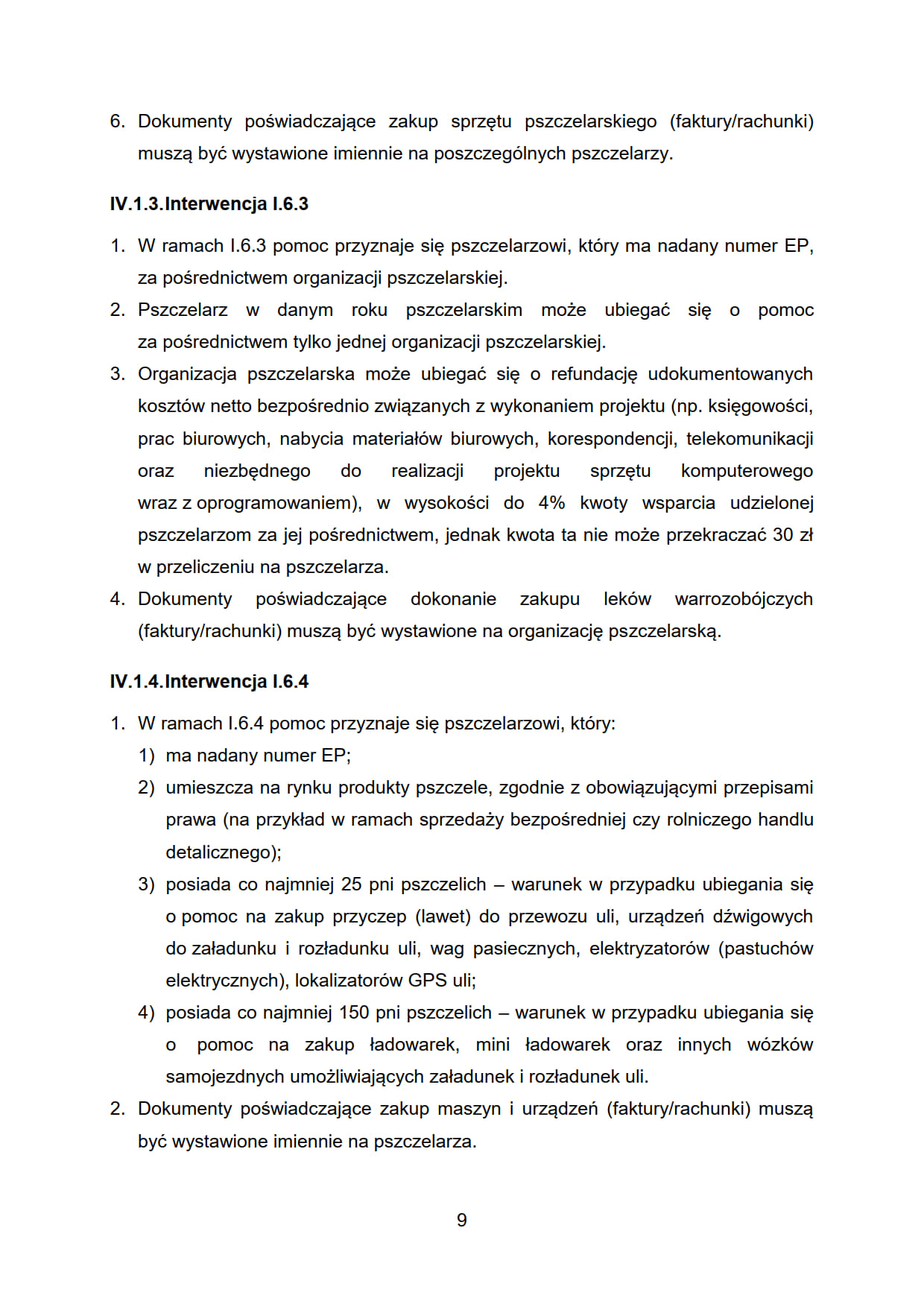 9. Beneficjent, który jest uprawniony do korzystania z pomocy w ramach interwencji I.6.2 i I.6.4, nie może korzystać w ramach PS WPR ze wsparcia w ramach interwencji I.10.1.1 „Inwestycje w gospodarstwach rolnych zwiększające konkurencyjność” (dotacje) oraz interwencji I.10.5 „Rozwój małych gospodarstw”, w zakresie sprzętu pszczelarskiego, maszyn i urządzeń wykorzystywanych na potrzeby gospodarki pasiecznej, wspieranych w ramach niniejszych interwencji.