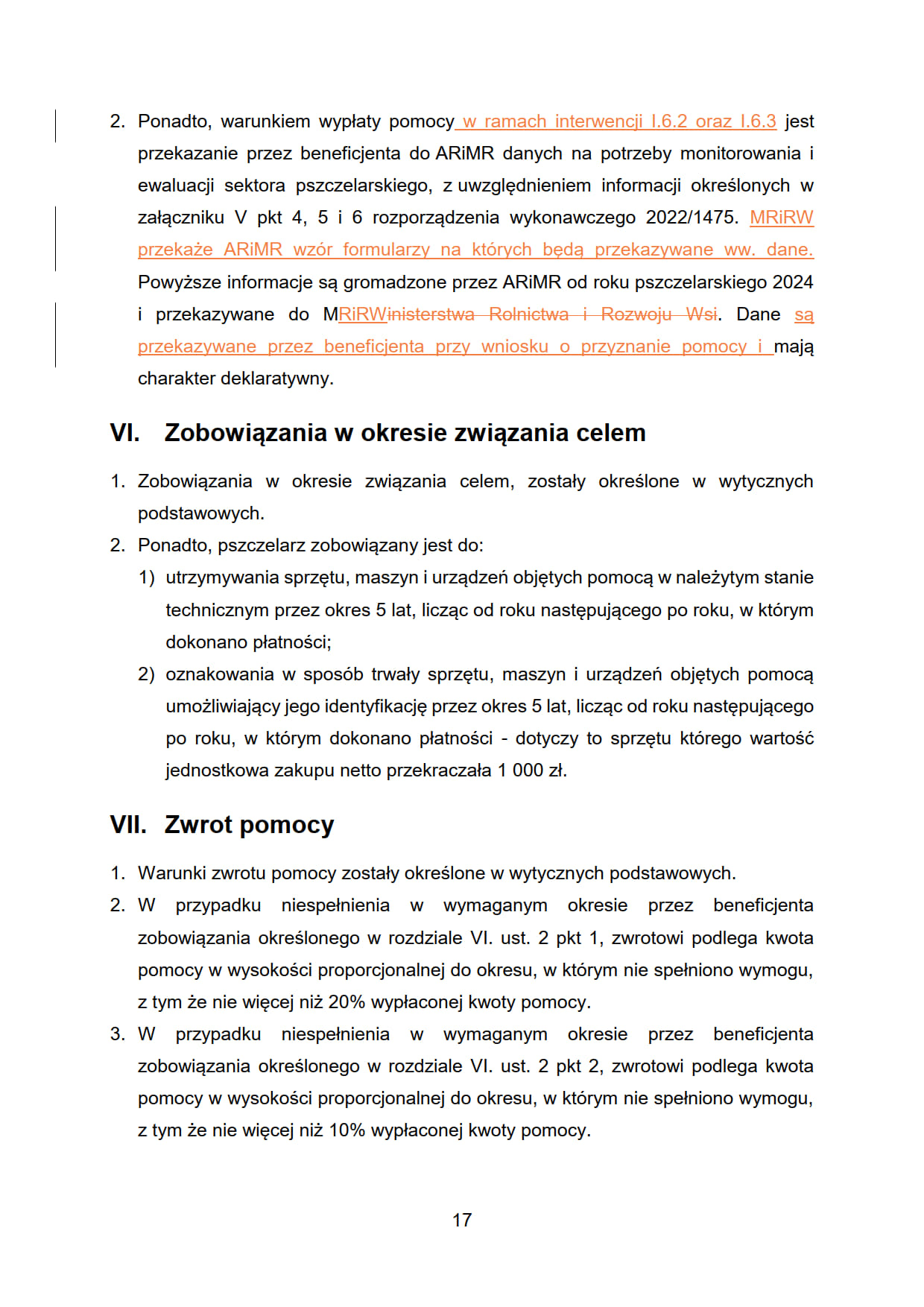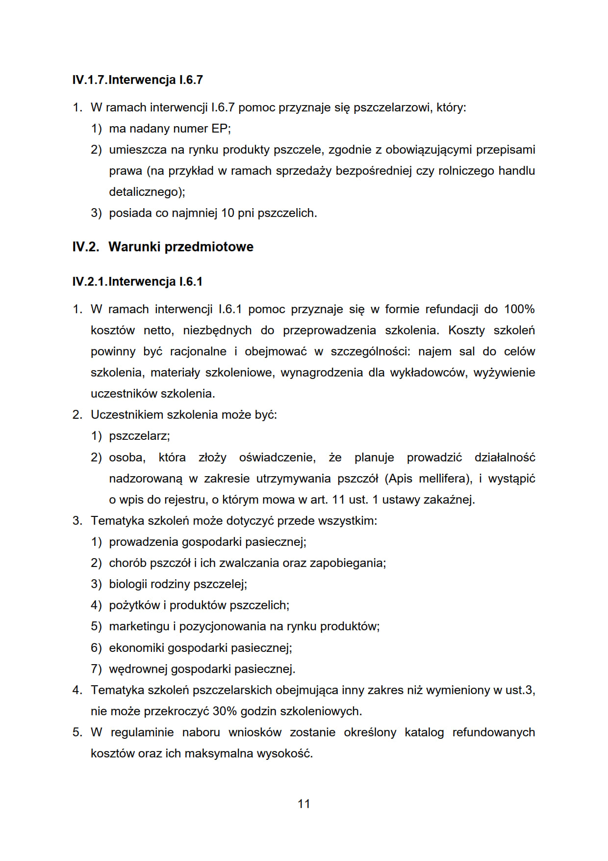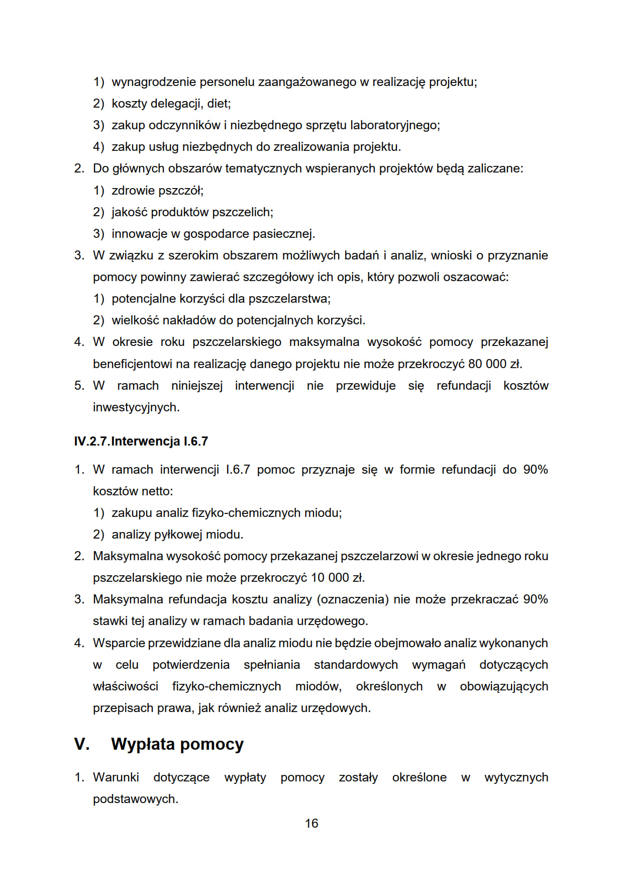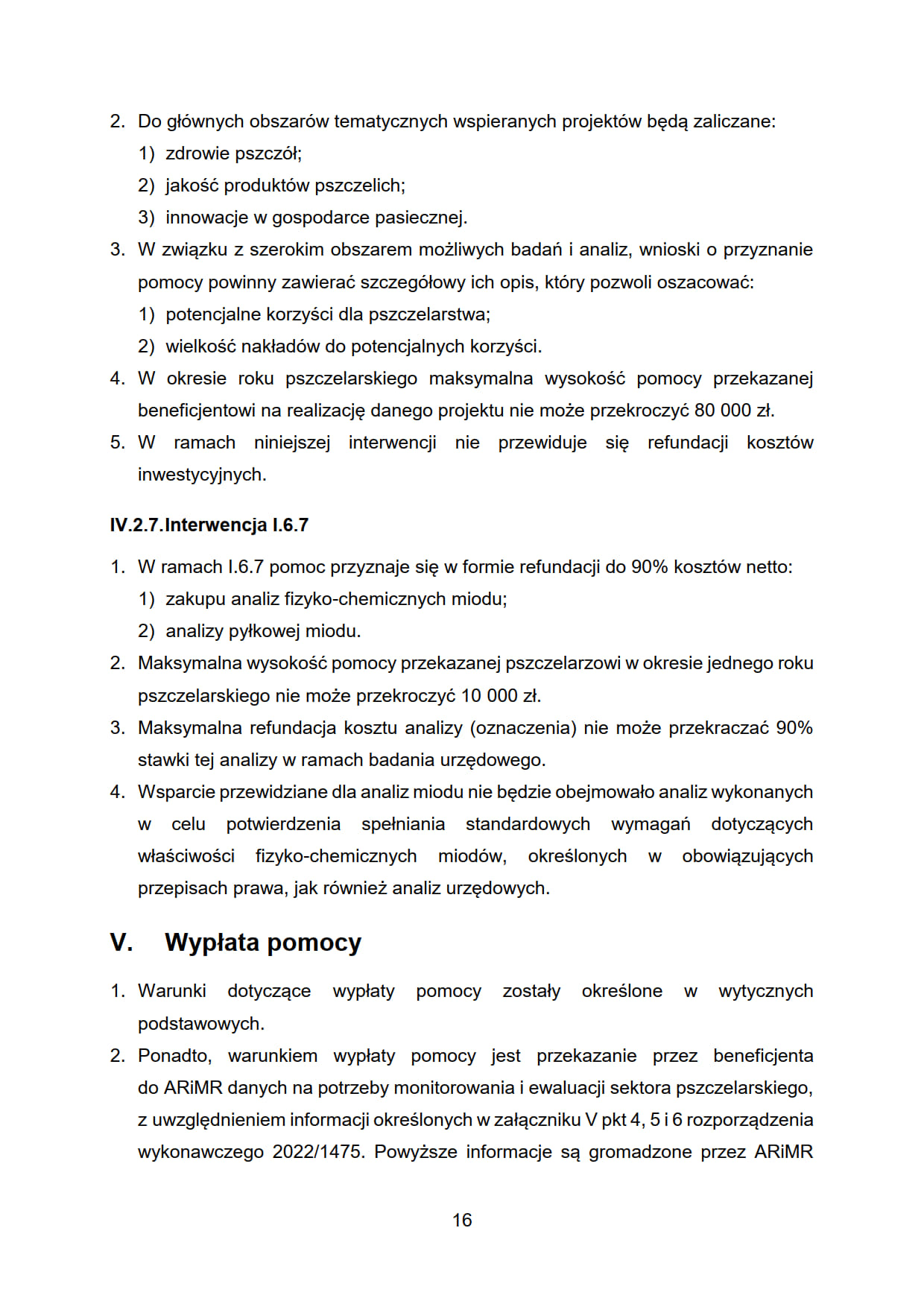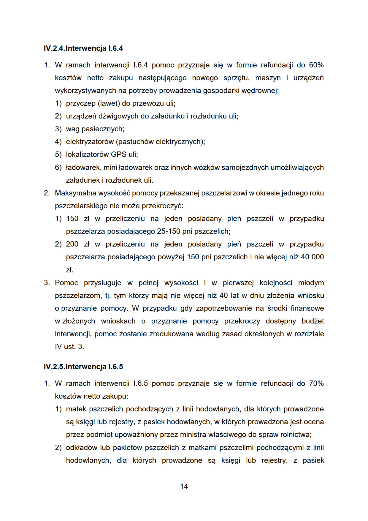 - I.6.5. „Interwencja w sektorze pszczelarskim - pomoc na odbudowę i poprawę wartości użytkowej pszczół”.