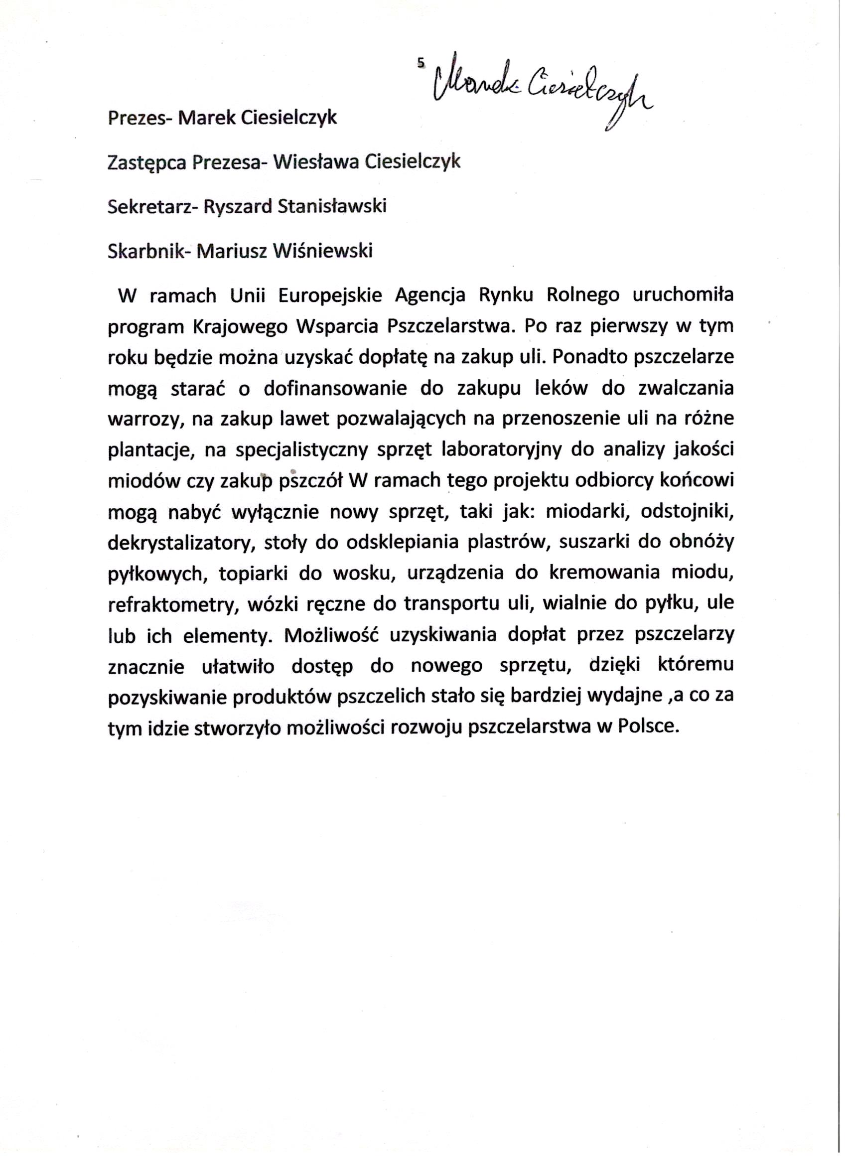 w imieniu Zarządu Regionalnego Związku Pszczelarzy z siedzibą w Koninie